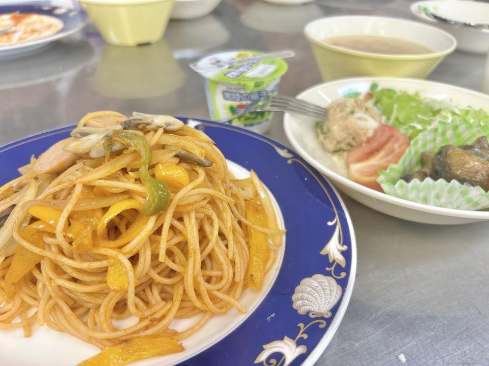 今回のメニューは、ナポリタンとともに野菜スープとサラダ。ヨーグルトのデザート付きでした。