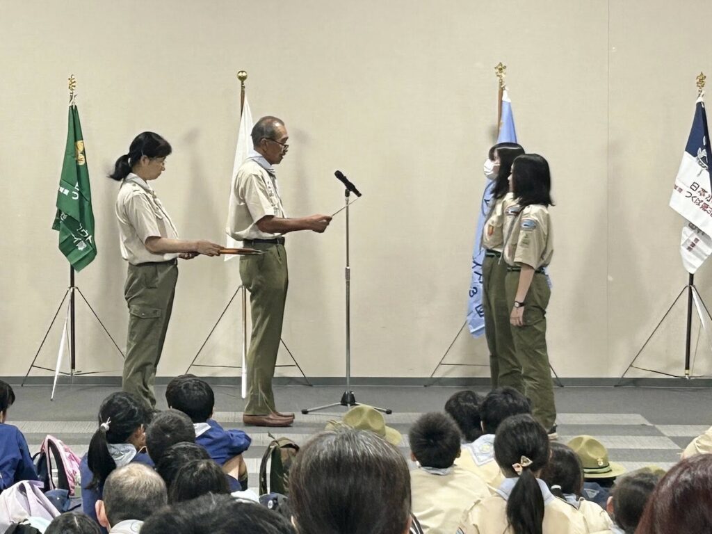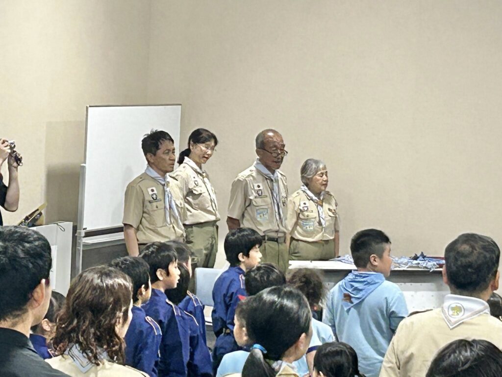 上進したスカウトたちが力強く誓いを立てる姿に成長を感じました。また、新たに入団されたスカウトと指導者となられた皆様にネッカチーフが授与され、新しい仲間を迎えることができました。これからの活動が楽しみです!