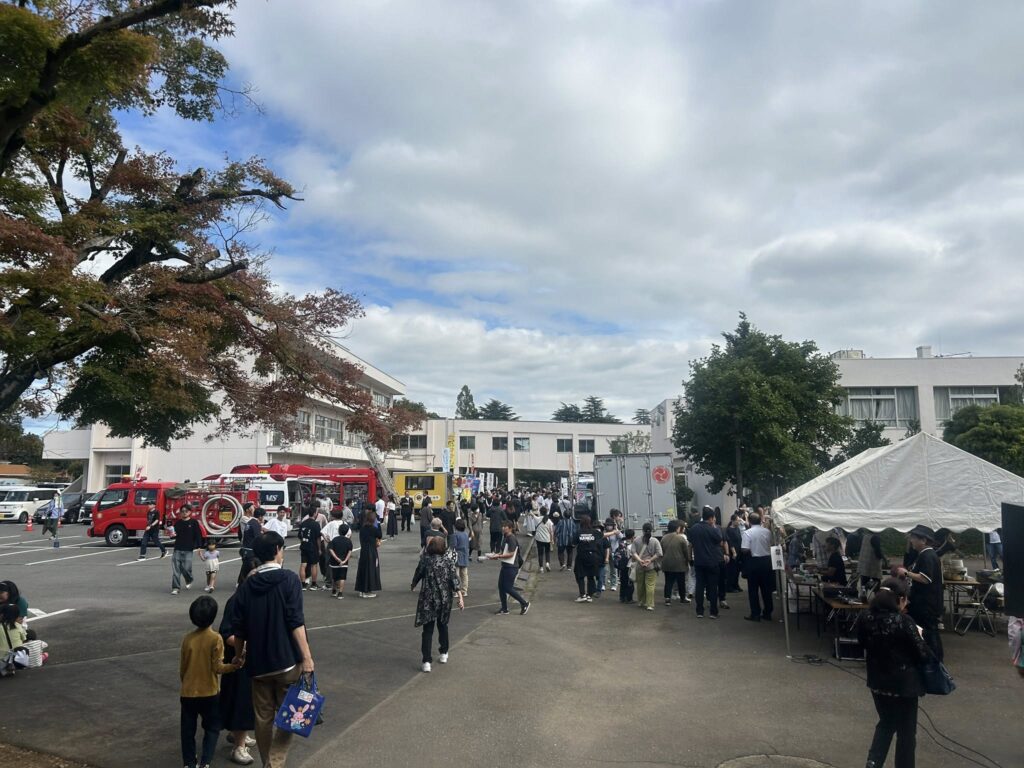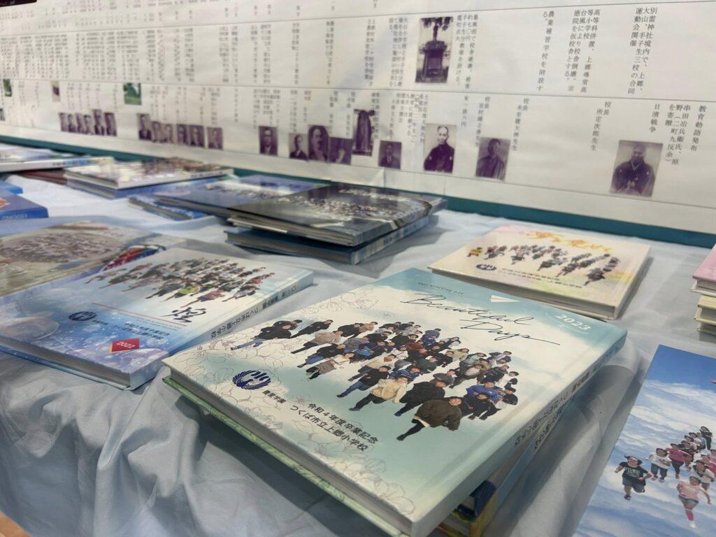 屋外にはキッチンナーなど多数並び、子どもたちはもちろん、多くの卒業生も来場。体育館では、各年代の卒業アルバムも勢ぞろい。懐かしさを感じながら、卒業生の皆様も記念イベントを楽しんでいるようでした。