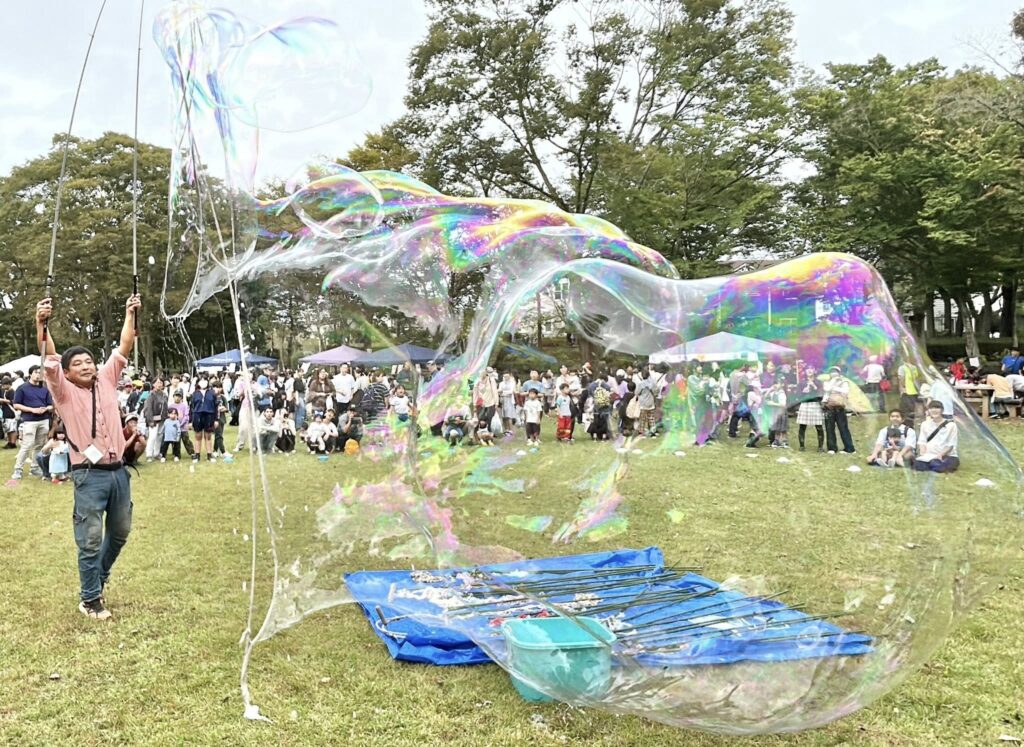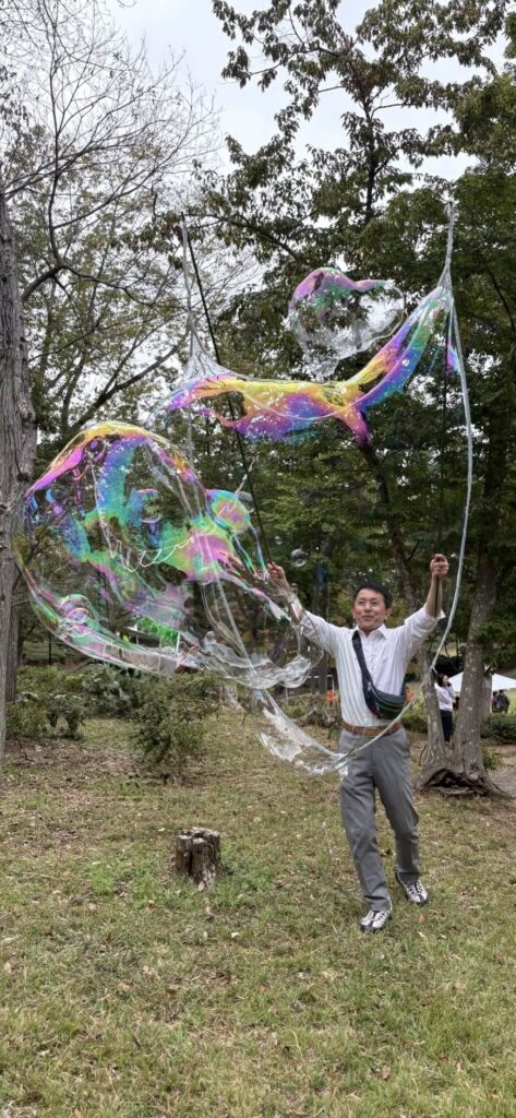 今年も、しゃぼん男爵のシャボン玉ショーのお手伝い。様々なシャボン玉が作られるたびに、子どもたちは大はしゃぎで追いかけていました。子供たちに人気のショーですね。私もシャボンだを体験してきました。
