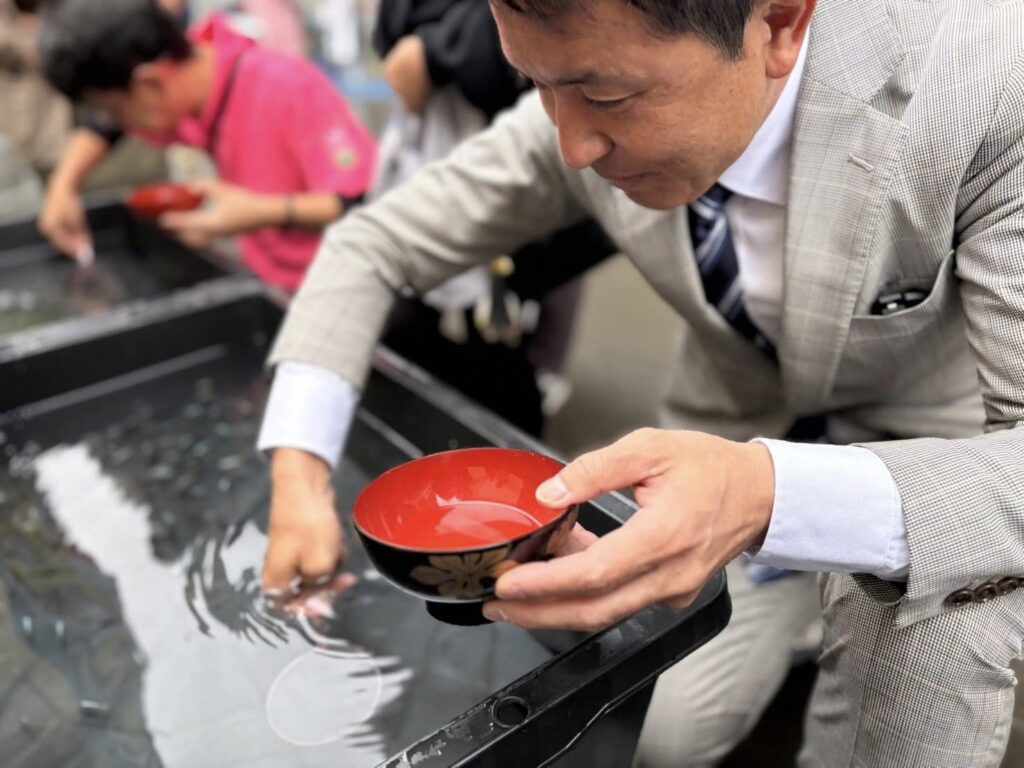 屋外に設置されたアトラクションブースを体験しました。また、めだかすくいにもチャレンジ。かなり時間をかけましたが、4匹ゲットできました。