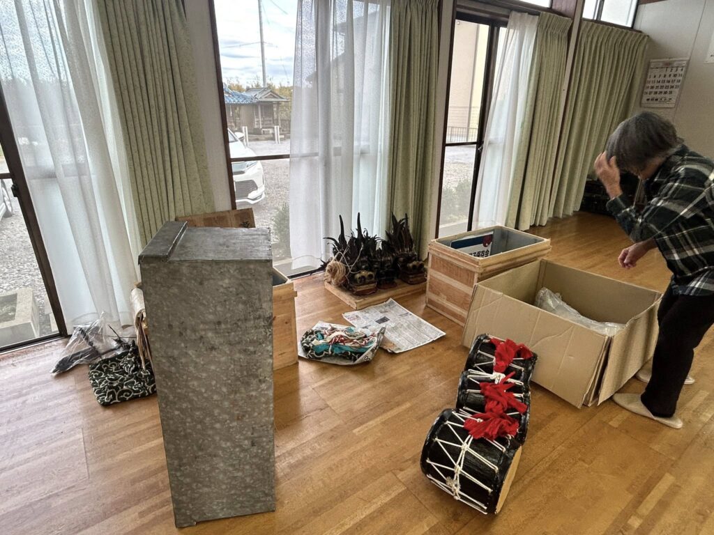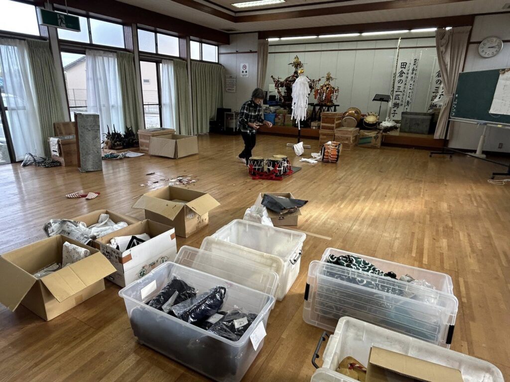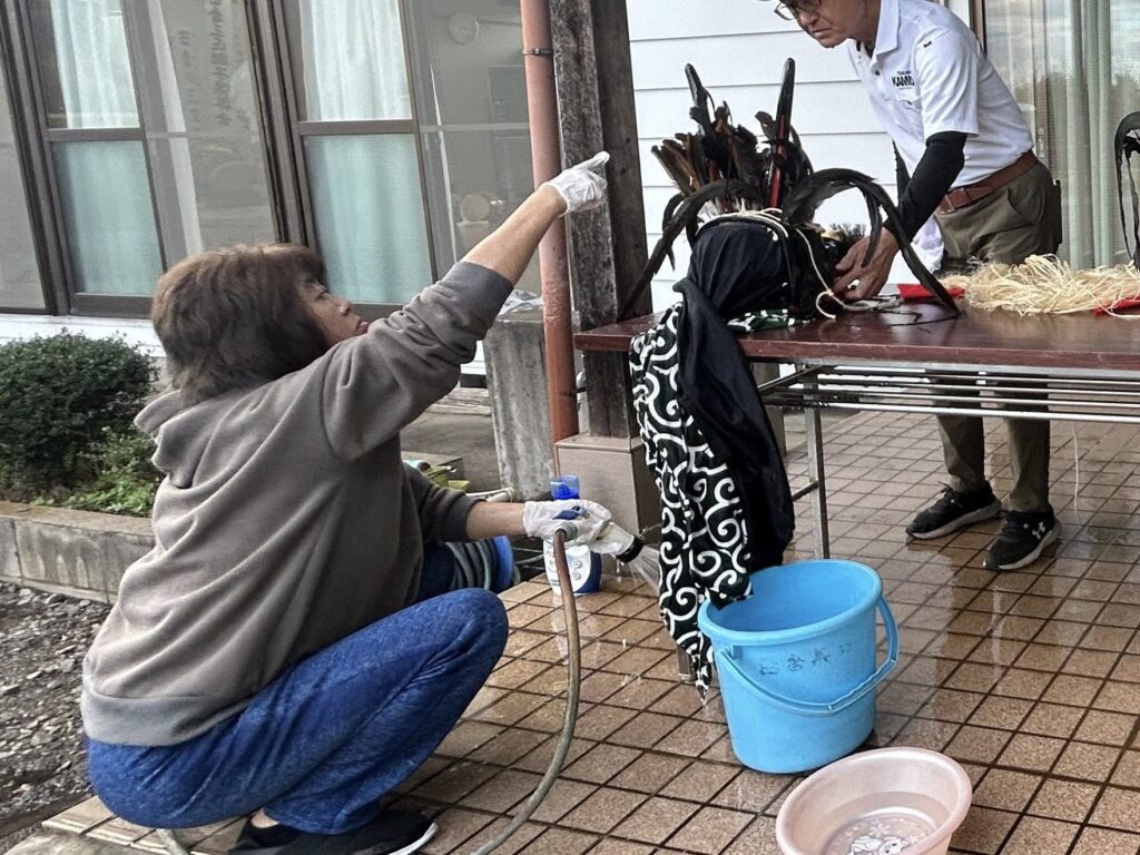 田倉三匹獅子保存会で獅子頭等のお手入れ作業。これまでの出舞で汚れてしまった獅子頭や羽織、のぼり旗などを誇りを取って、洗い流しました。