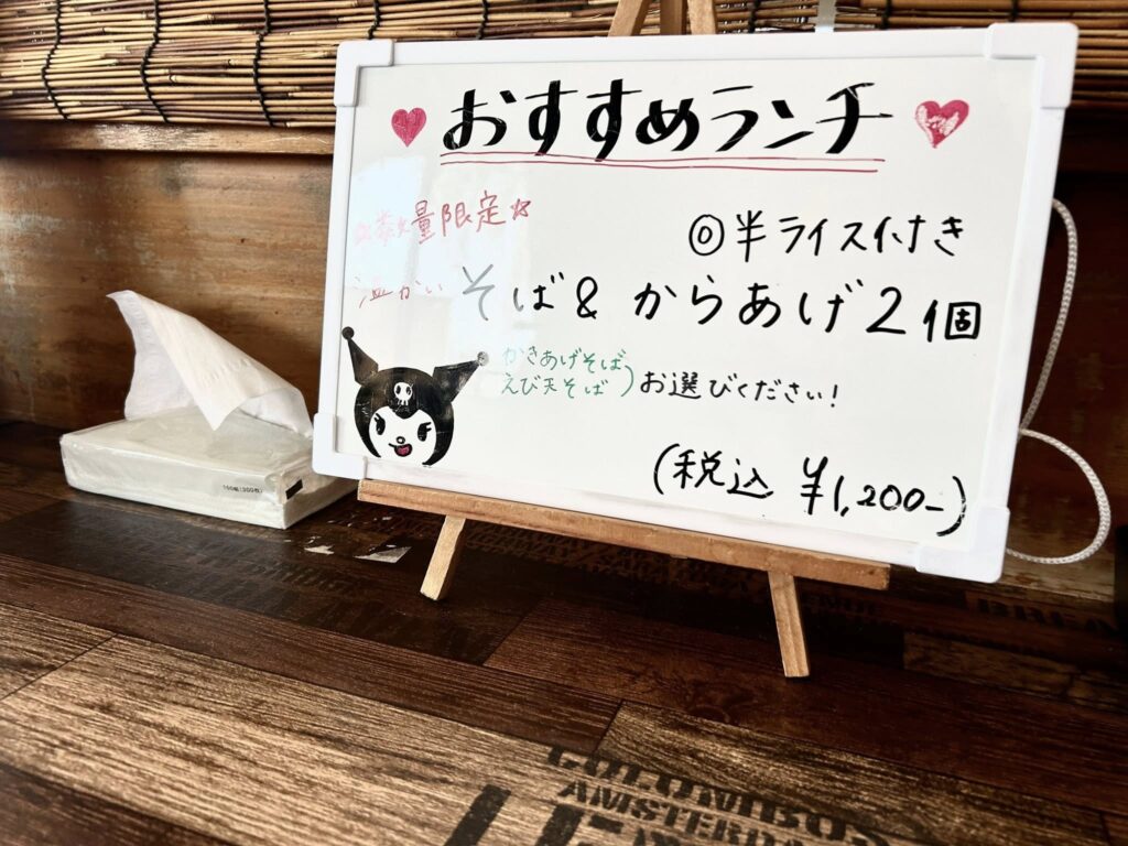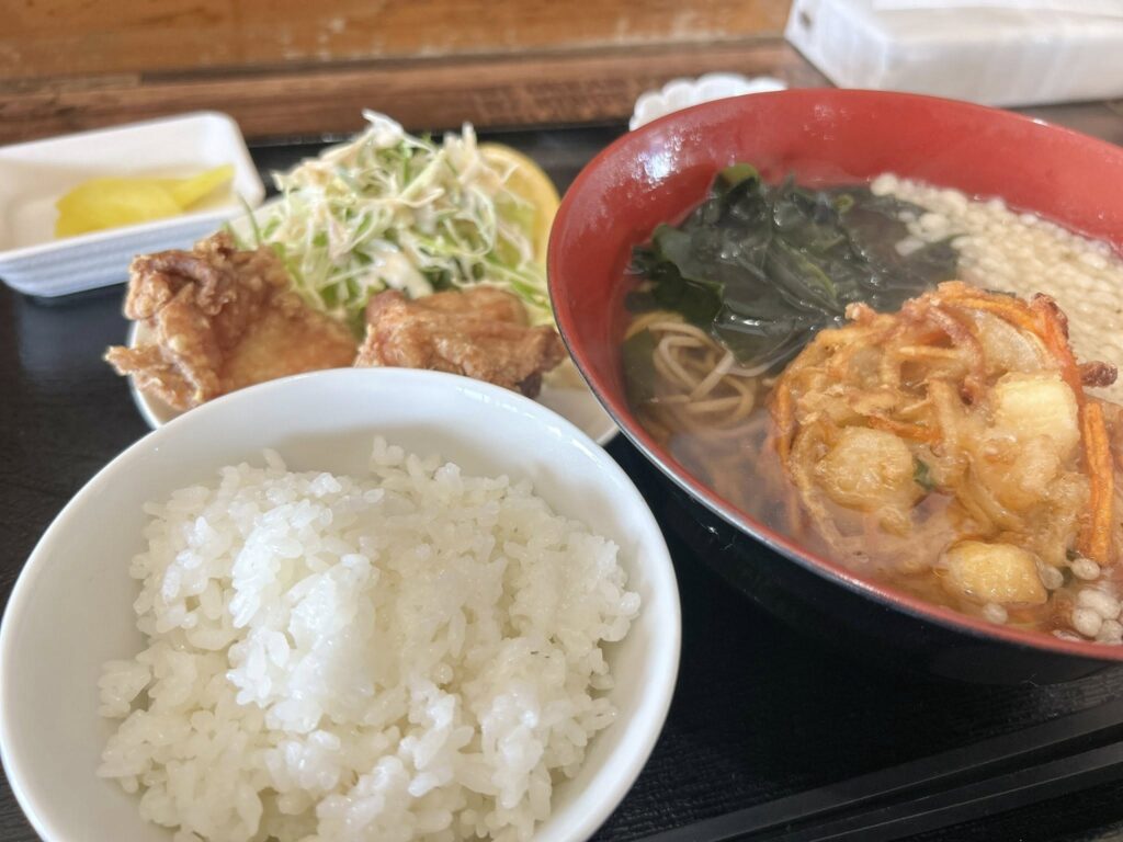 おすすめランチメニューのそば&からあげ、ライス付きをいただきました。冷えた体にそばで温まりました~。https://www.instagram.com/meshidokoro_harahetta/
