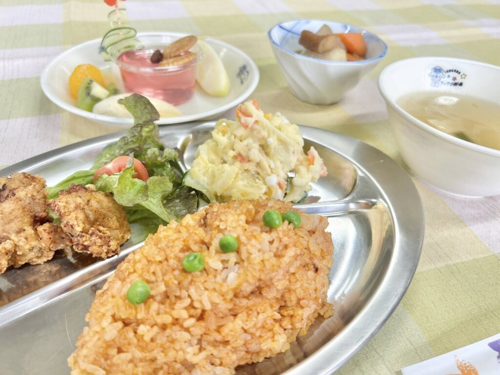 今日のお昼は、大曽根みんなの食堂でランチ。 チキンライスとから揚げをメインにデザート付きです。早速、満席の大盛況でした。お隣に座っていた方は、90歳。子供から大人まで、楽しく利用させていただいています。