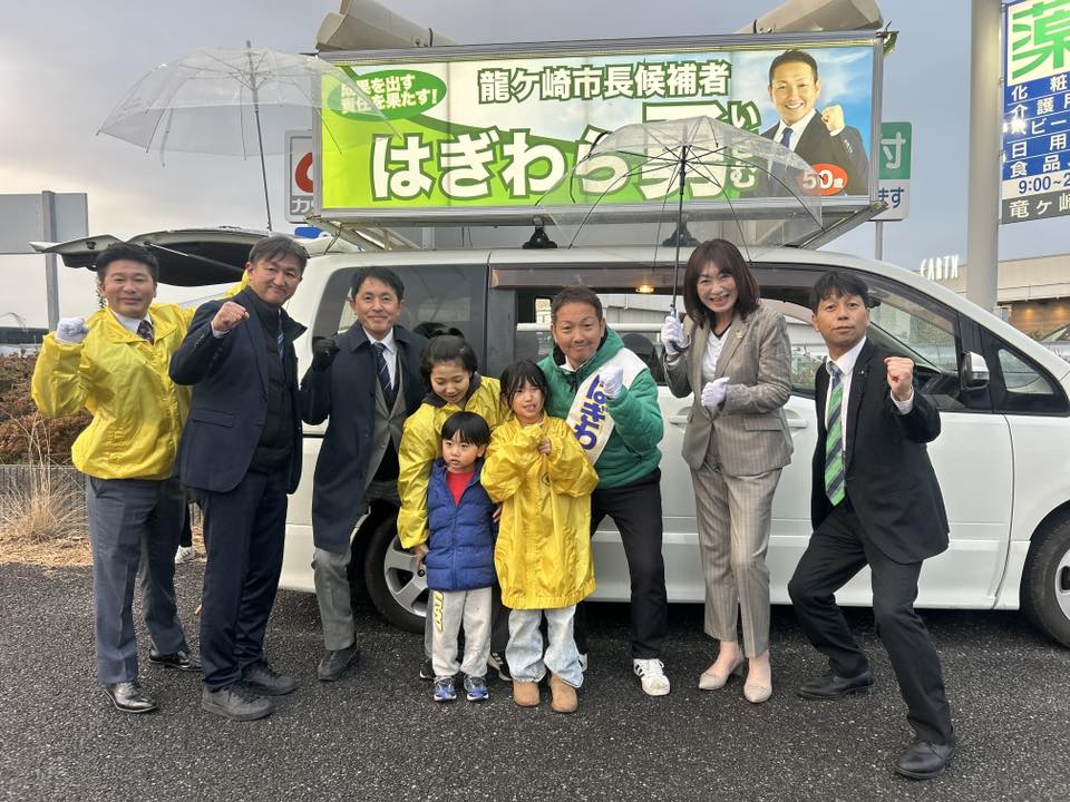龍ヶ崎市長選挙の最終日。2期目の当選を目指す、はぎわら勇候補の街頭演説会に駆け付けました。