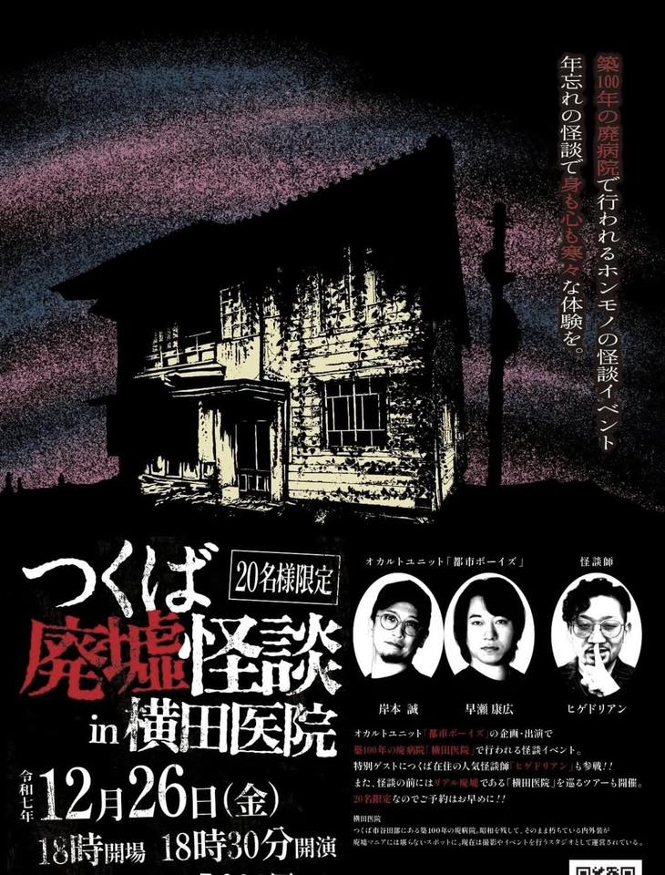 谷田部内町で長らく空き家となっていた横田医院。その病院を会場に、つくば廃墟怪談in横田医院が開催されました。オカルトユニットの都市ボーイズの皆さんの企画です。