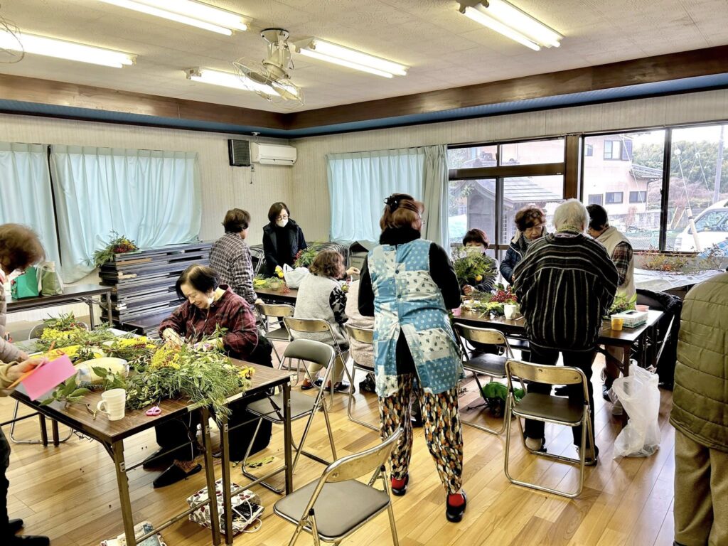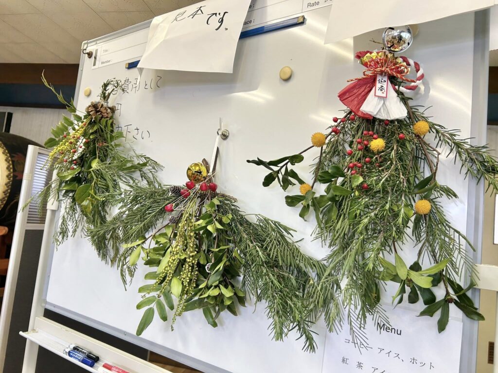自前のカップで、こだわりのコーヒーをいただきながら一休み。今回は、正月飾りづくりが行われていました。庭木を活用して素敵な正月飾りが出来上がっていました。素敵です。
