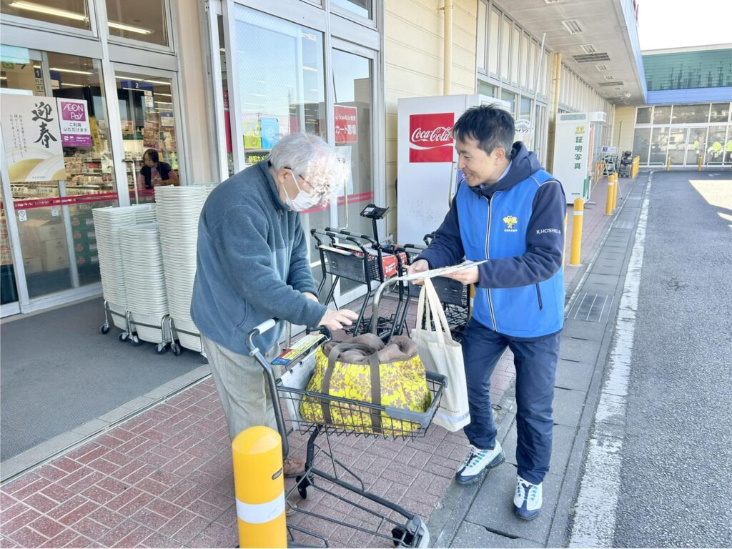 フードマーケットカスミ 筑波店への来店客の皆様に、反射材などの交通安全グッズを配布して、交通安全を呼びかけました。
