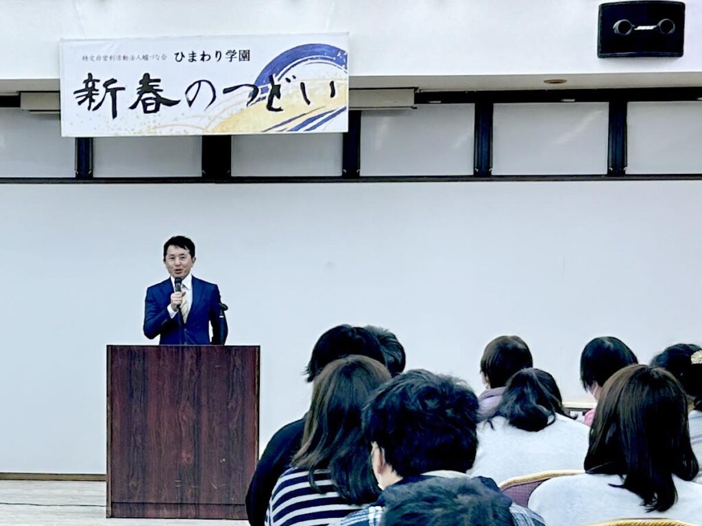 就労支援事業所の特別非営利法人艫づな会ひまわり学園の令和8年新春の集いに出席。利用者やご家族、施設スタッフの皆様へ新年のご挨拶をしました。