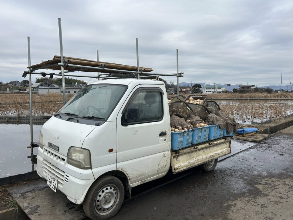 広々とした畑で、寒さの中ひとつひとつ丁寧に掘り上げてられています。収穫したばかりのレンコンが軽トラに満載です。収穫は春ごろまで続くそうです。