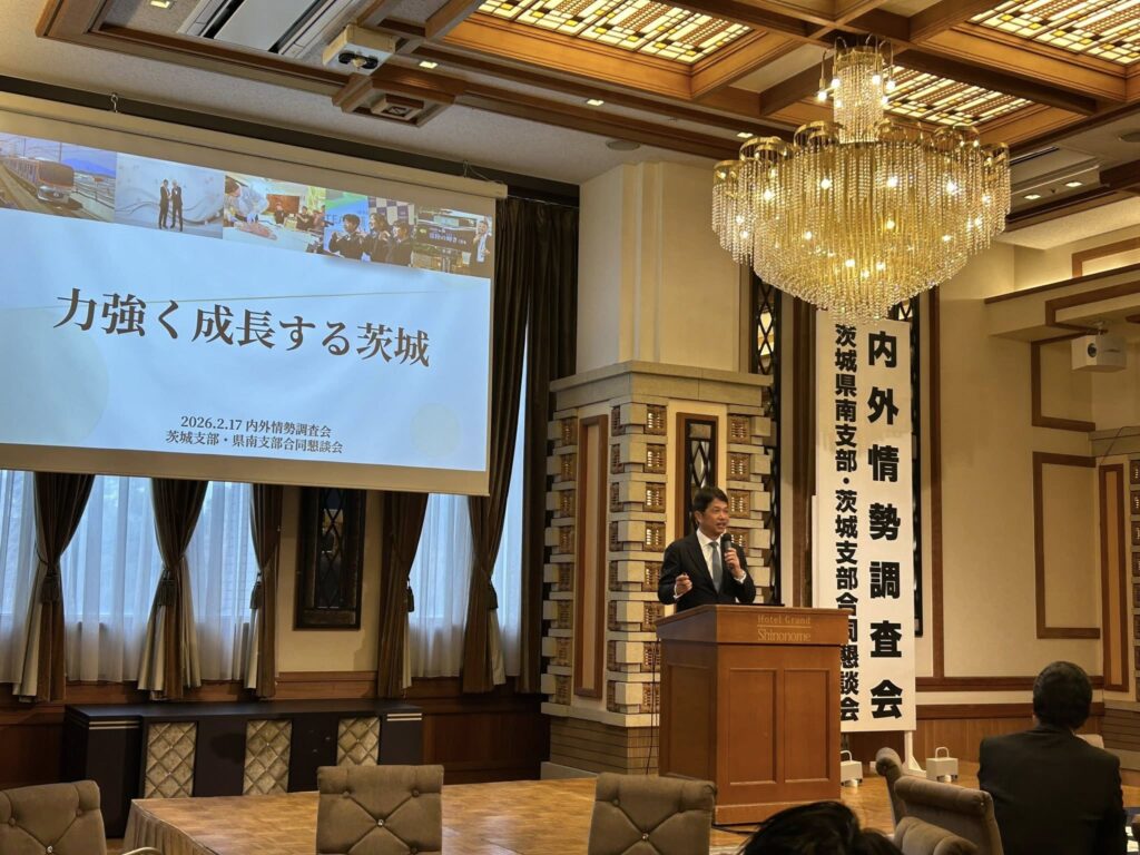 内外情勢調査会の茨城県南支部2月懇談会に出席しました。今回は、講師に大井川和彦 茨城県知事を迎えて、「力強く成長する茨城県」と題した講演。8年連続県外企業立地件数8年連続全国1位をはじめとする県政における実績や、今後の新たなチャレンジなど、表題の通り茨城県の成長についてお話しいただきました。