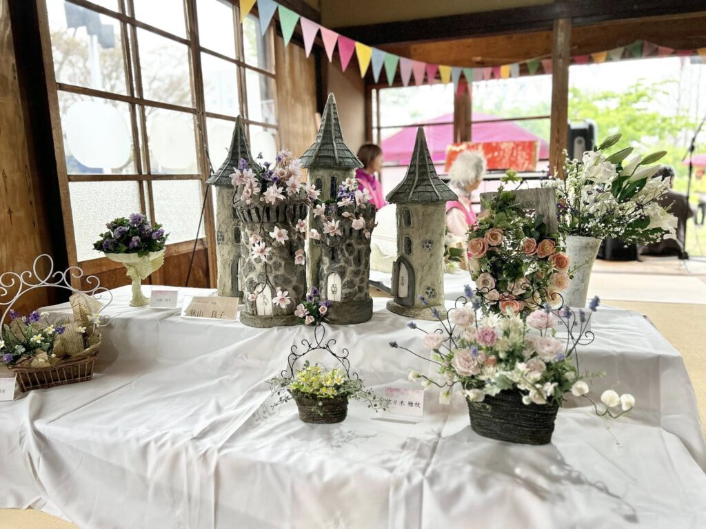 雨が降ったりやんだりとあいにくのお天気でしたが、音楽ステージのプログラムも開催され、古民家内でのパンフラワーはじめ多くの作品が展示。昔遊びコーナーでは、メンコやベーゴマを楽しみました。