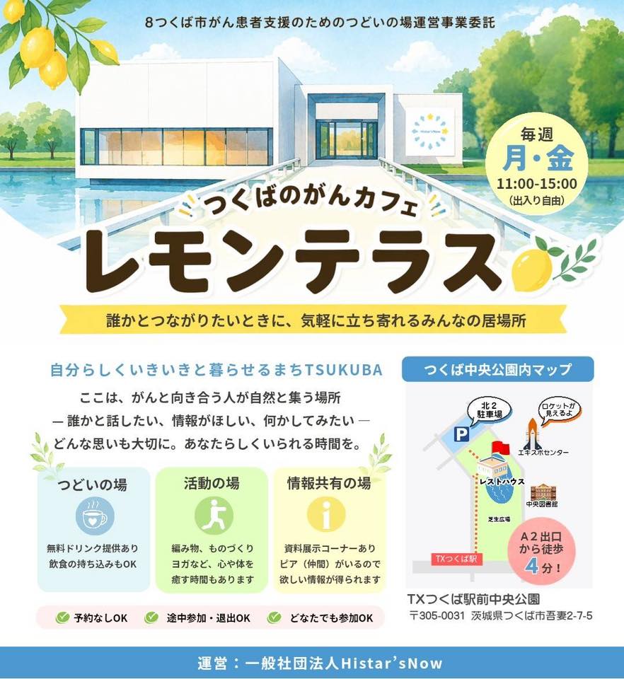 今月から、がんと向き合う人が自然と集う場所として「つくばのがんカフェ レモンテラス」がスタートしました。中央公園レストハウスで、毎週月曜日と金曜日の11時から15時にオープンしています。